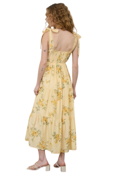 Yellow Floral Tiered Midi Dress: